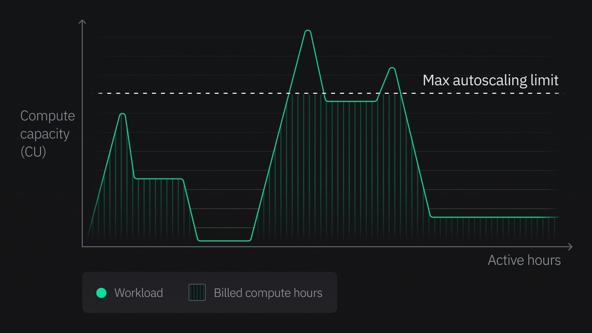 Compute size is measured in CUs. Database branches autoscale from 0.25 to 8 CU based on load and down to zero when inactive.